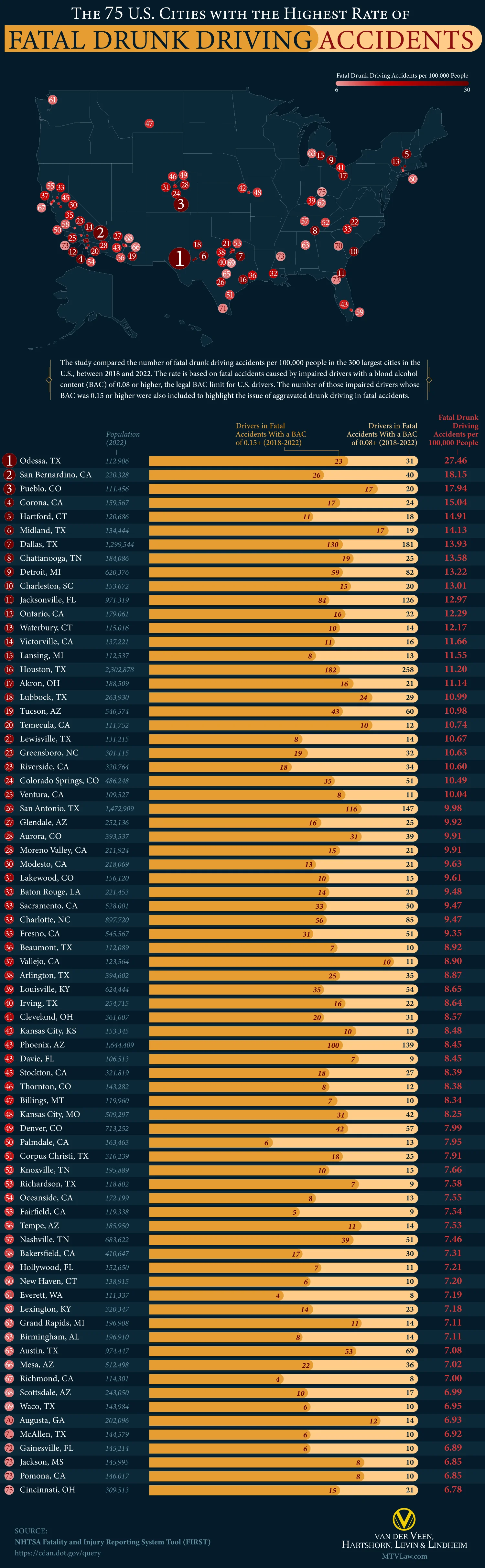 To determine where the highest rate of fatal drunk driving accidents occurs in the U.S., the team at van der Veen, Hartshorn and Levin compiled data using the NHTSA’s Fatality and Injury Reporting System Tool. The study compared the number of fatal drunk driving accidents per 100,000 people in the 300 largest cities in the U.S., between 2018 and 2022. The rate is based on deadly accidents caused by impaired drivers with a BAC of 0.08 or higher, the legal BAC limit for U.S. drivers. The number of impaired drivers whose BAC was 0.15% or higher was also included to highlight the issue of aggravated drunk driving in fatal accidents. Drivers with a blood alcohol content of 0.15+ represent a large portion of the impaired drivers that were responsible for fatal drunk driving crashes during this time. Explore the sobering statistics below to see which cities across the U.S. suffer the most from deadly drunk driving accidents.