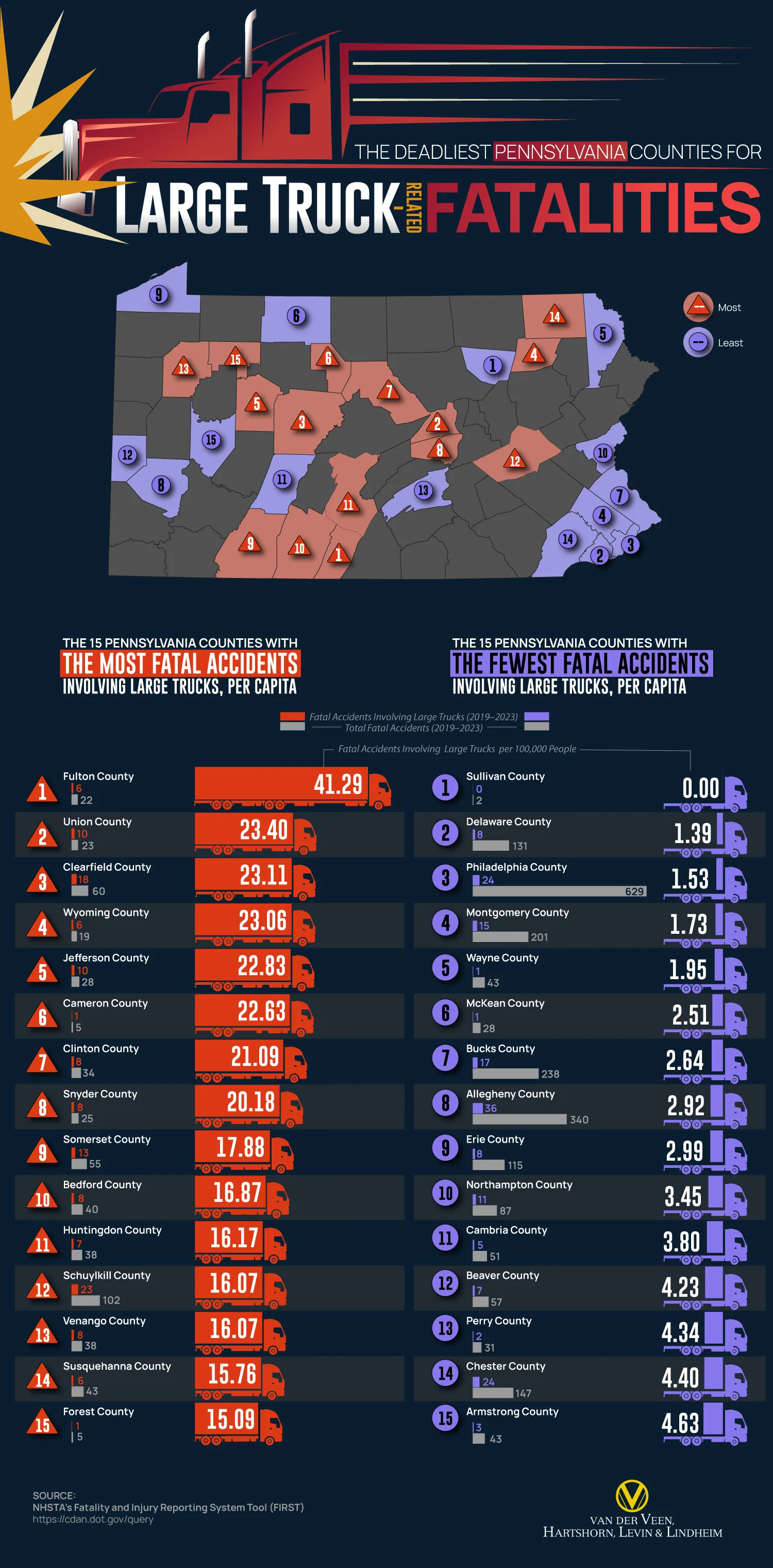 | Pennsylvania County | Fatal Accidents Involving Large Trucks (2019–2023) | Total Fatal Accidents (2019–2023) | Fatal Accidents Involving Large Trucks per 100k People | |