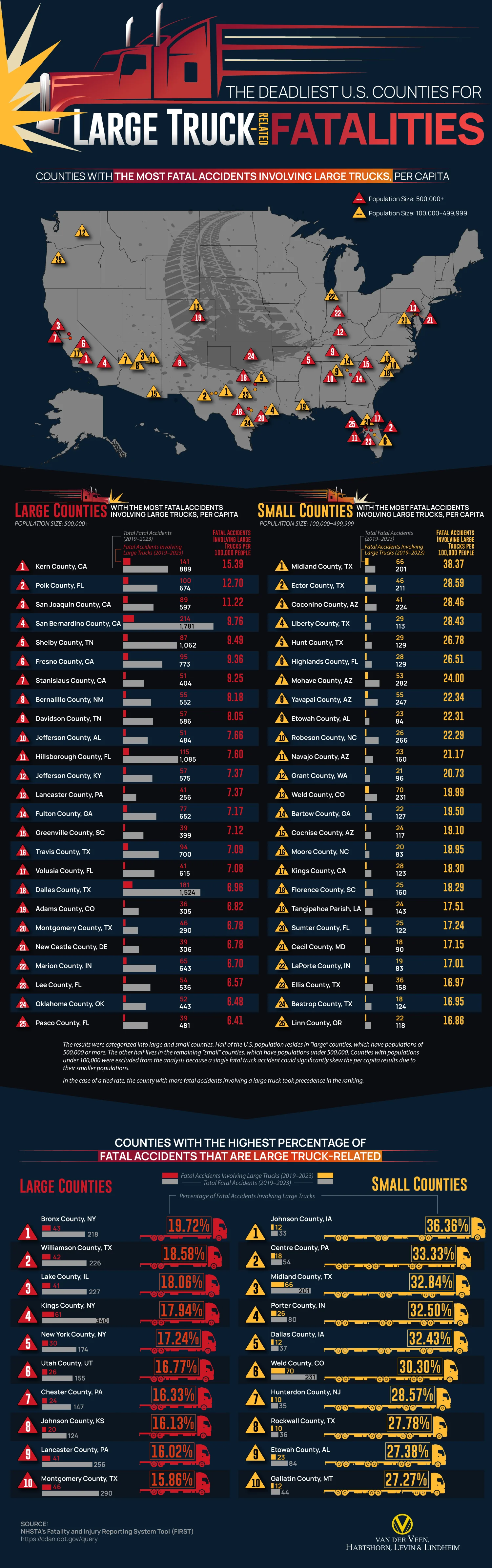 Counties with the highest number of fatal truck crashes per capita indicate where these tragedies occur most frequently compared to the population. Those with the highest percentages reveal where truck crashes account for an unusually large share of all deadly accidents, even if their overall numbers are smaller, and regardless of their population size. The next set of rankings is important because they help identify where large trucks pose a disproportionate danger.